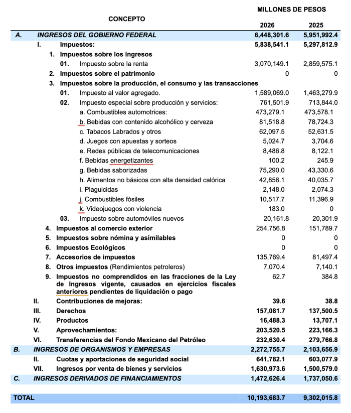 El 15 y 28 de octubre respectivamente, fue aprobado por la Cámara de Diputados y por la Cámara de Senadores, el Paquete Económico para 2026, con algunos cambios respecto a la propuesta original presentada por la Presidenta Claudia Sheinbaum.
