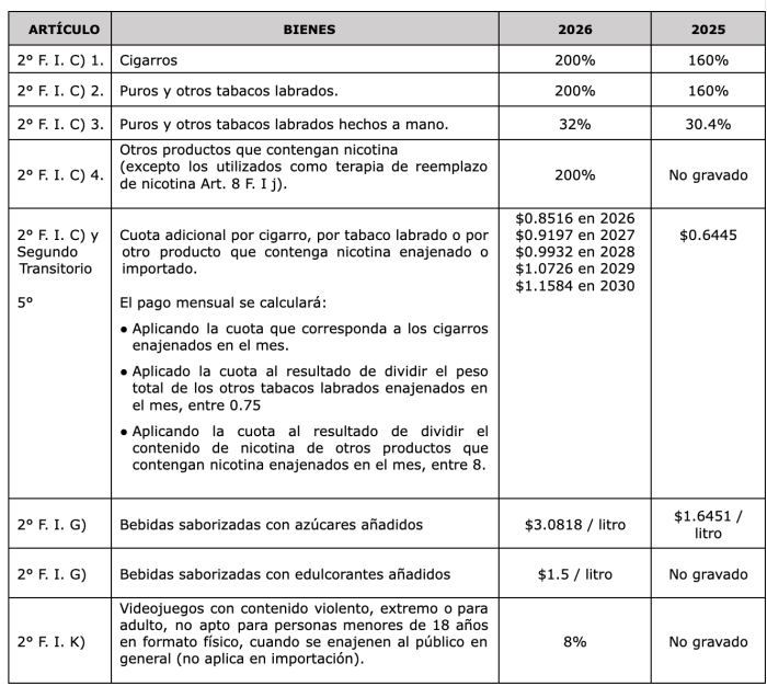 Se incrementan las tasas y cuotas de IEPS y se establecen nuevos gravámenes en la enajenación o importación de los siguientes bienes y servicios:
