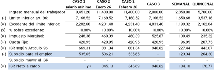* En el Caso 1, por tratarse de un trabajador que gana el salario mínimo, aunque se calcula ISR a cargo no se realiza retención, según lo establecido en el artículo 96 de la Ley del ISR.