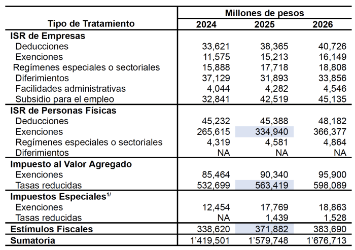 El monto total de este rubro se estima en $334,940 millones de pesos, y está compuesto principalmente por los ingresos exentos por salarios que ascienden a $251,375 millones de pesos; por la exención a los ingresos derivados de intereses de las SIEFORES (Fondos de inversión en los que las AFORES invierten los recursos de los trabajadores para generar rendimientos) por $65,388 millones de pesos; por la exención en la enajenación de casa habitación por $13,973 millones de pesos, así como por $4,204 millones de pesos de otras exenciones.